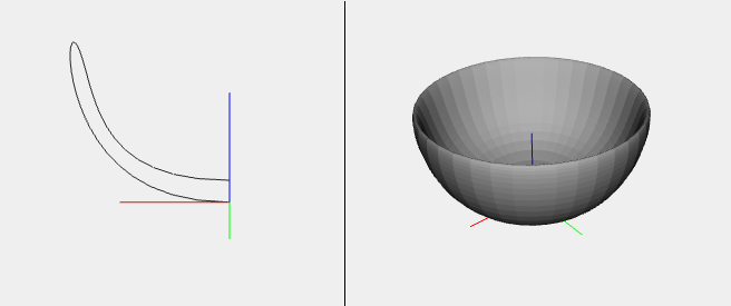The first image shows the profile of the bowls achieved with Bezier. The second image shows instead the solid of rotation obtained by applying the function Rotational Surface to the profile's curve. The following example shows the code for creating a solid of rotation: